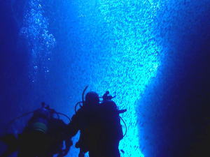 不思議なスポットです。水中に沈む全長40mという長さの空洞は、青と黒と光が