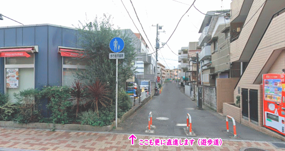一つ目の交差点も更に直進し、遊歩道を直進してください。右手に【ガスト】があり