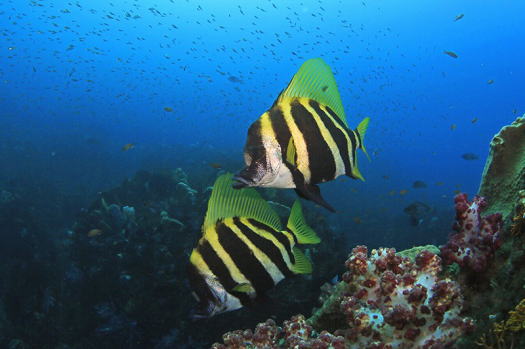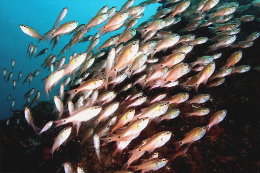 ダイナミックな地形に、大型の回遊魚が桁違いの群れで生息しています。岩場のポイントが多く